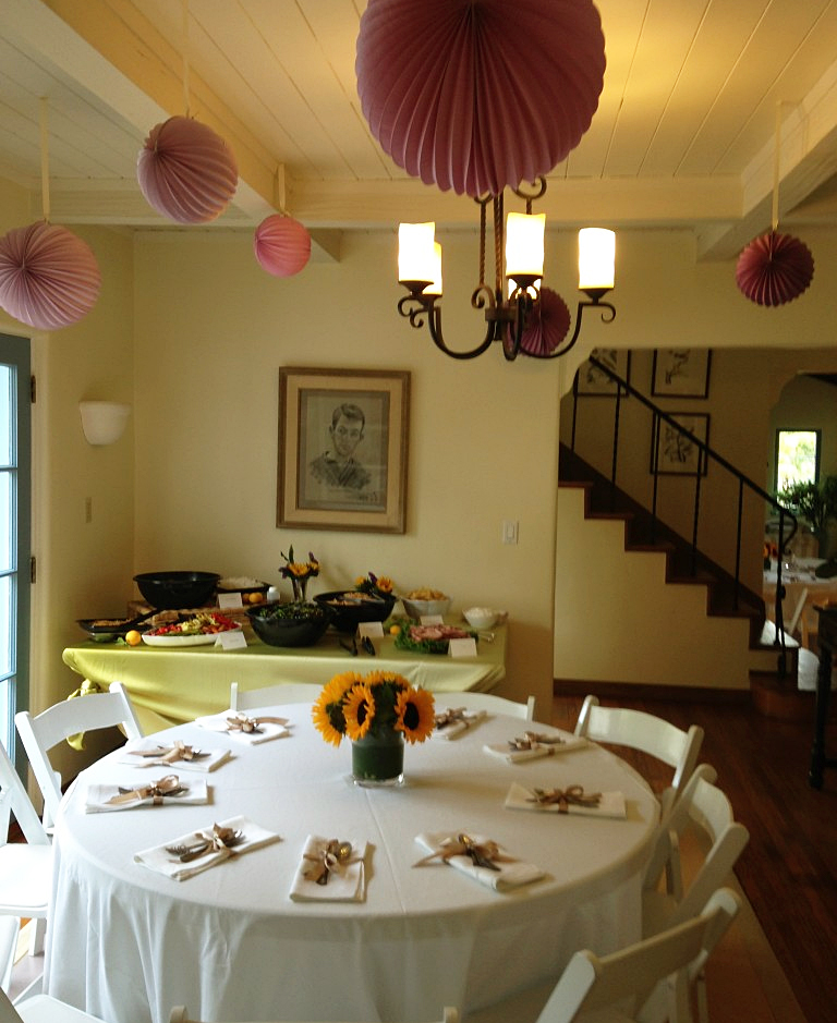 It never rains in L.A. in August … except a couple of Sundays ago. Which could have been a disaster, since we had planned a post-wedding garden brunch for 45 relatives. At the last minute, we cleared the living and dining rooms to set up the party indoors, and the party turned out to be a big hit. The smaller, more intimate space got people closer, the guests talked a lot more with each other, and everybody had a great time. What could’ve been a two hour brunch lasted five hours until the final guest ambled out.