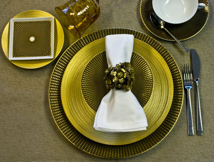 J.L. Coquet’s Hemisphere Gold dinnerware provides a sparkling dinner plate and bread & butter plate.