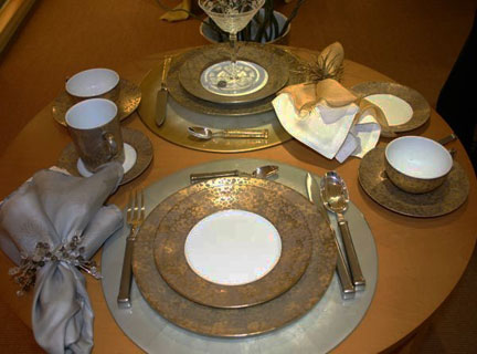 J.L. Coquet’s Hemisphere Gold dinnerware provides a sparkling dinner plate and bread & butter plate.