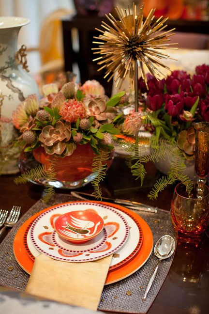 J.L. Coquet’s wide-band gold chargers are a great background statement.