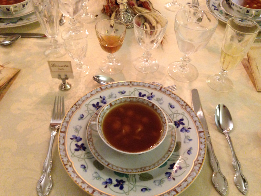 Did you recognize Haviland’s Imperatrice Eugenie dinnerware on the table? This is the same pattern Babette ordered from France for her feast and is especially appropriate to the story, since the Cafe Anglais was one of the greatest restaurants during the Second Empire, when Empress Eugenie and Emperor Napoleon III were at the height of their power.