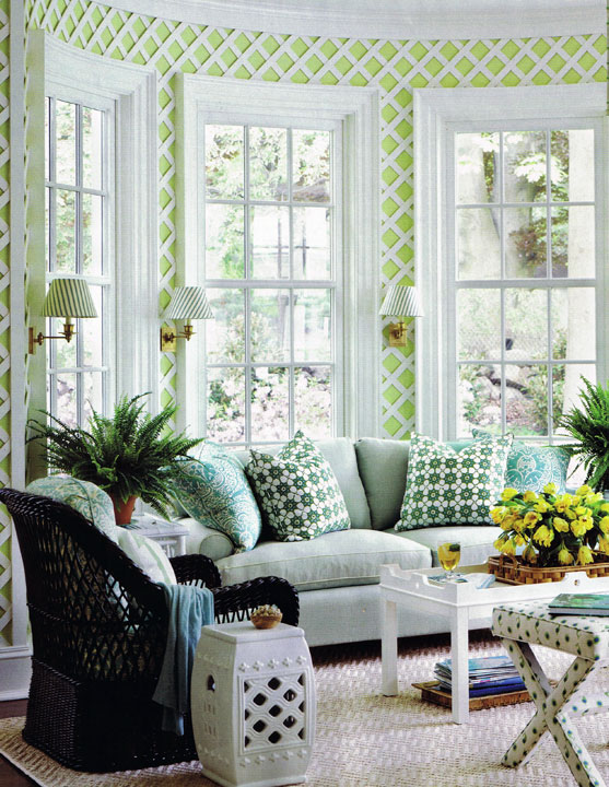This lovely sunroom was designed by Ashley Whittaker, and the trellis was inspired by Elsie de Wolfe. The white lacquer on the table is a wonderful neutral counterpart to the bright greens and patterns used in the room. The Fenwick coffee table is available in 16 glossy colors, so it will fit right into any room.