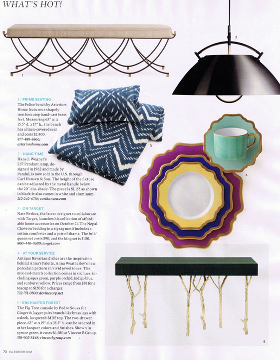 Color is back! We love Anna Weatherley‘s new dinnerware line, Anna’s Palette, for adding a pop of color to the table. The editors at Elle Decor love it too – it was featured in the October issue under “What’s Hot”.