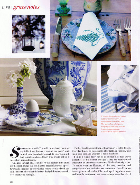 In the August issue of Veranda magazine, contributing editor Carolyne Roehm shared some thoughts about what makes the little things luxurious. It’s an inspiring read and the lovely photos are just as inspiring, including the setting of Royal Copenhagen’s Blue Fluted Full Lace.