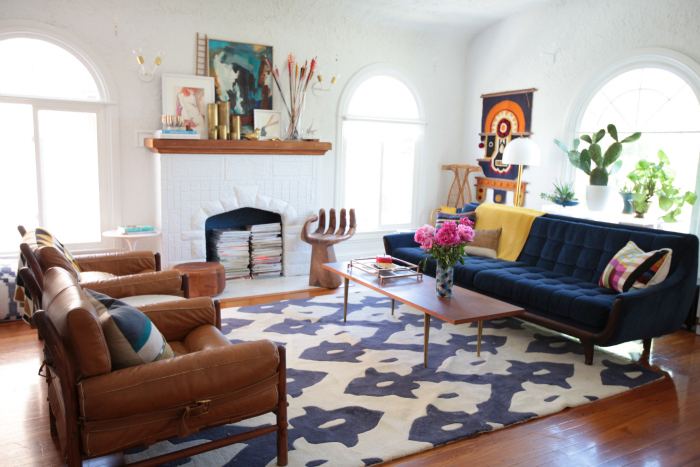 If you’d like a larger rug, block out any areas that you know will get a lot of floor traffic and place it in the middle of the space that’s left over. Sofas and chairs can be placed either completely on top of the rug, just with the two front legs on the rug, or a mix of both.