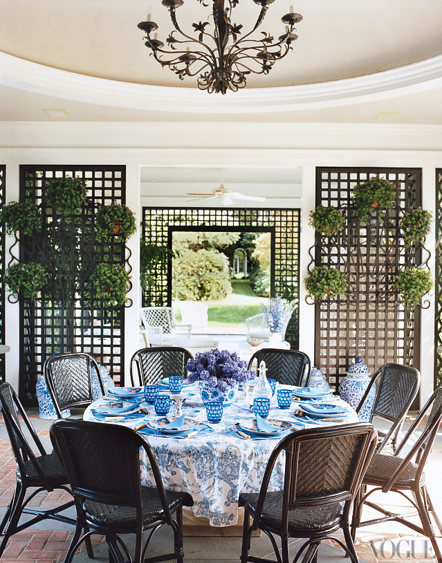 … while outdoors, the dining table in Tory’s trellis-paneled poolhouse is set with a blue toile tablecloth and Mottahedeh’s Tobacco Leaf dinnerware dinnerware.