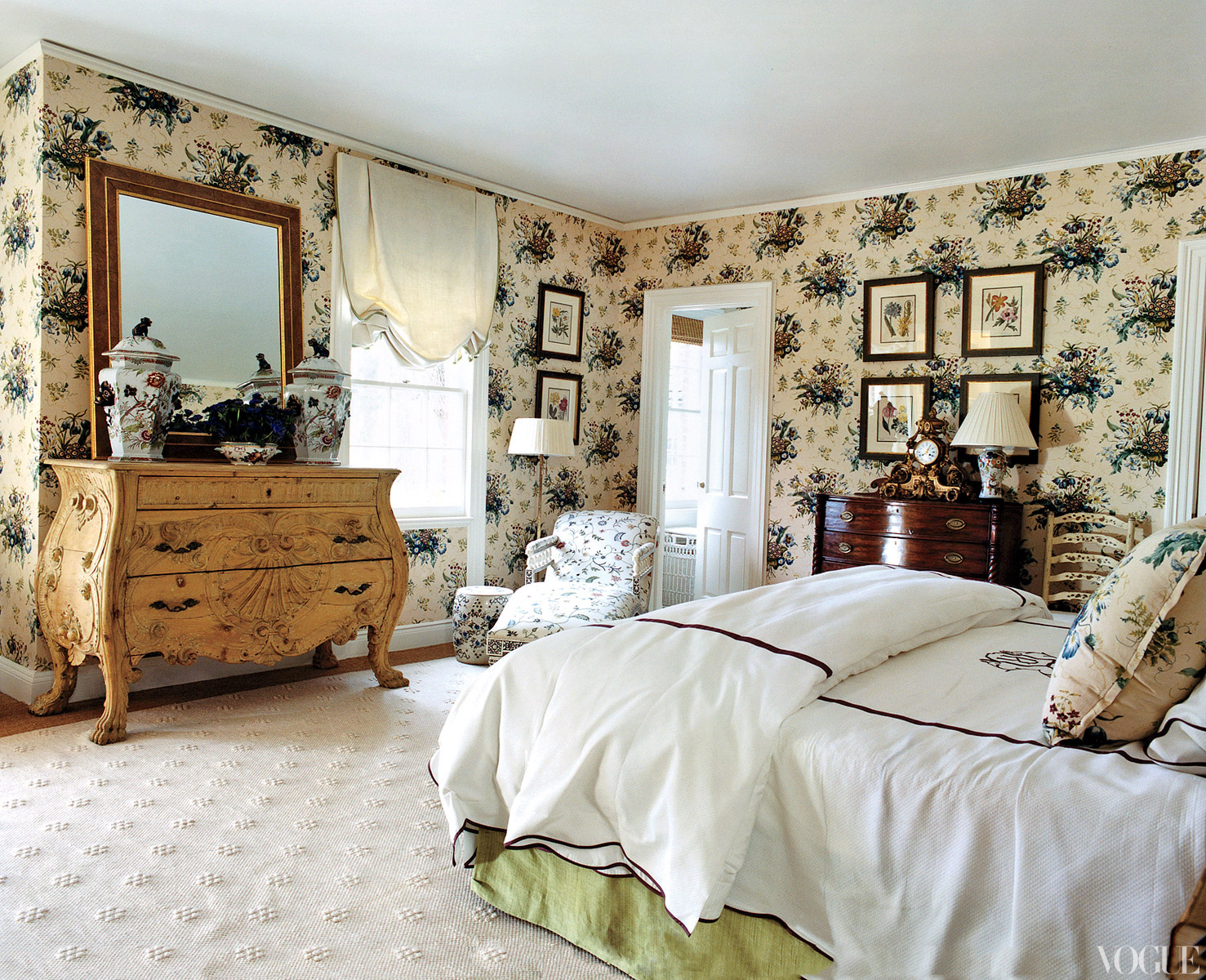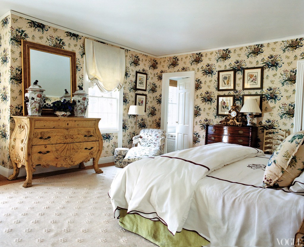 Finally, upstairs, the walls in the master bedroom are soothingly paneled with a Colefax and Fowler print …