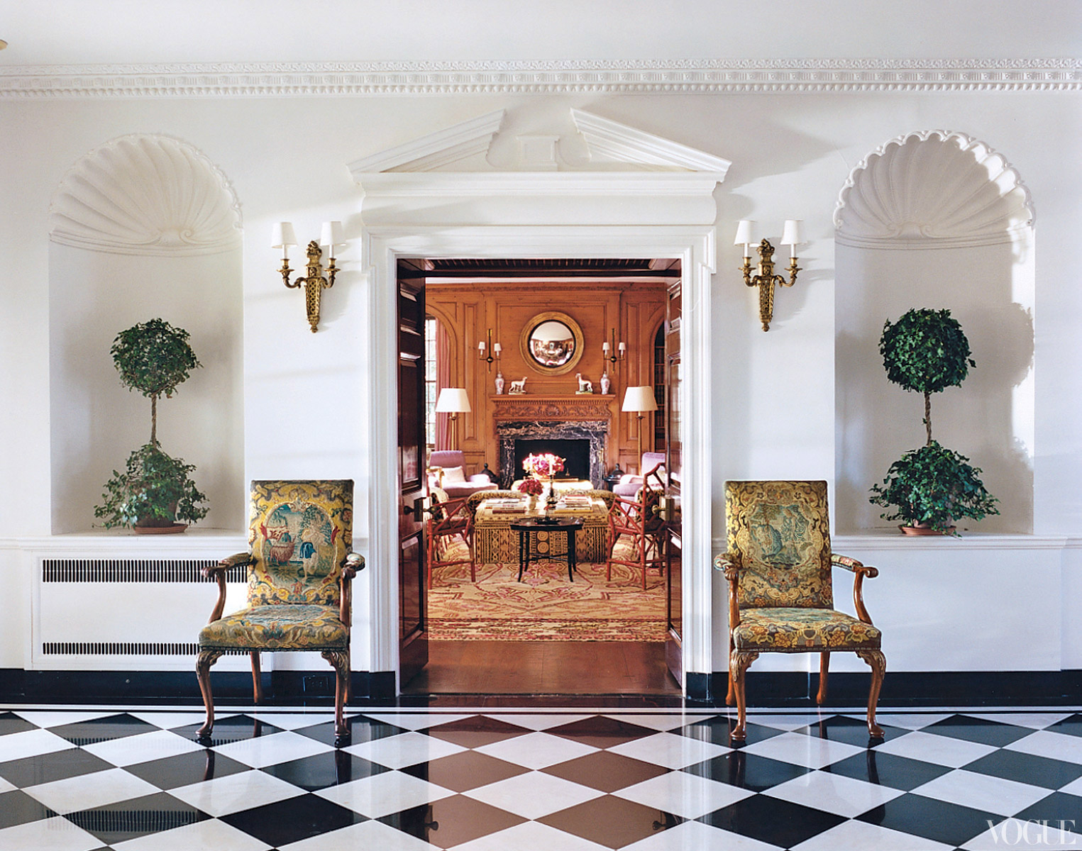 Boxwood topiaries and classic white-and-black marble floors in the gallery hallways lead to a wood-paneled library filled with touches of English style and chinoiserie …