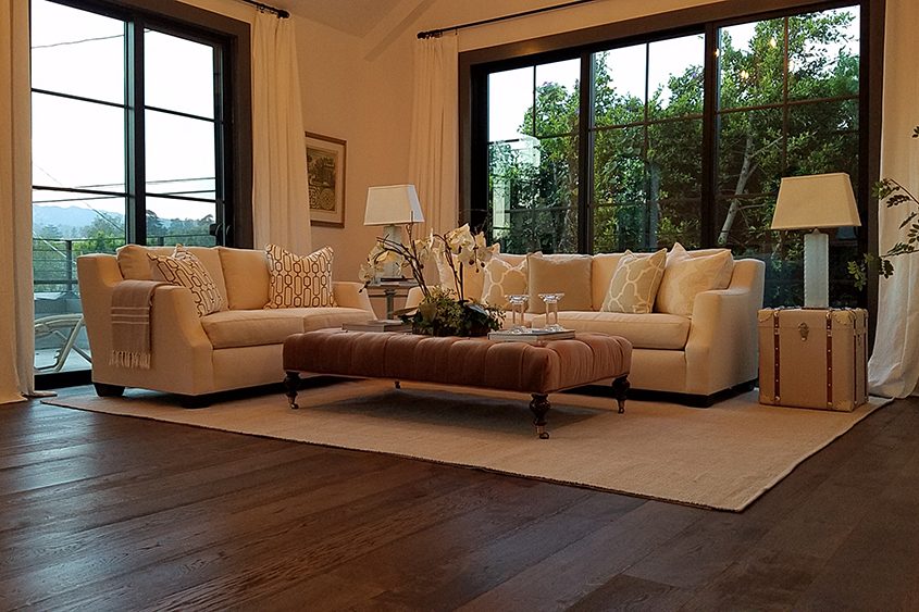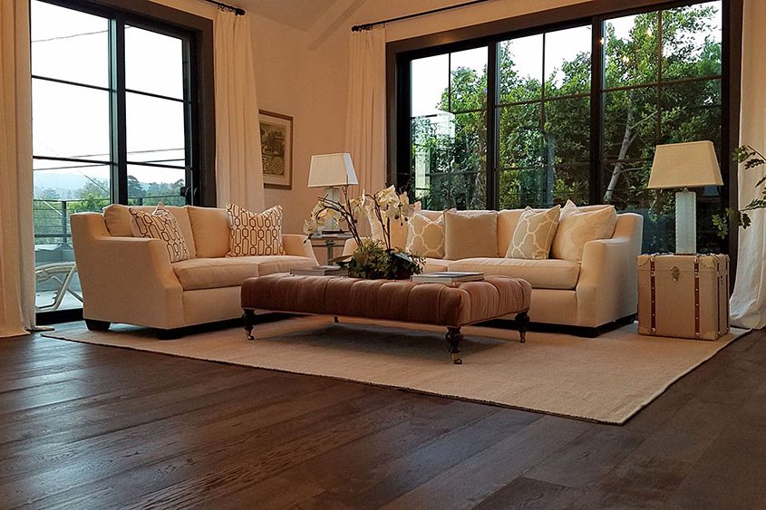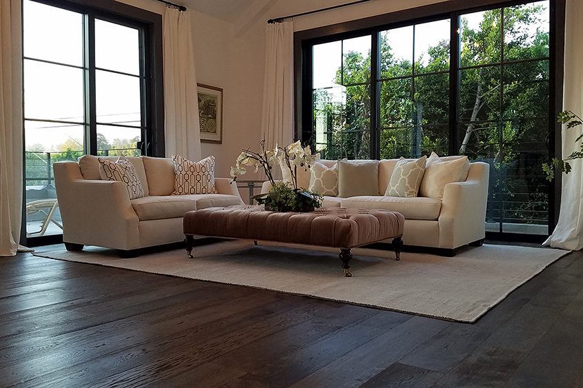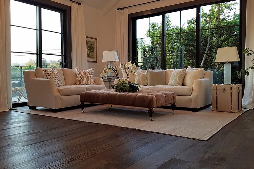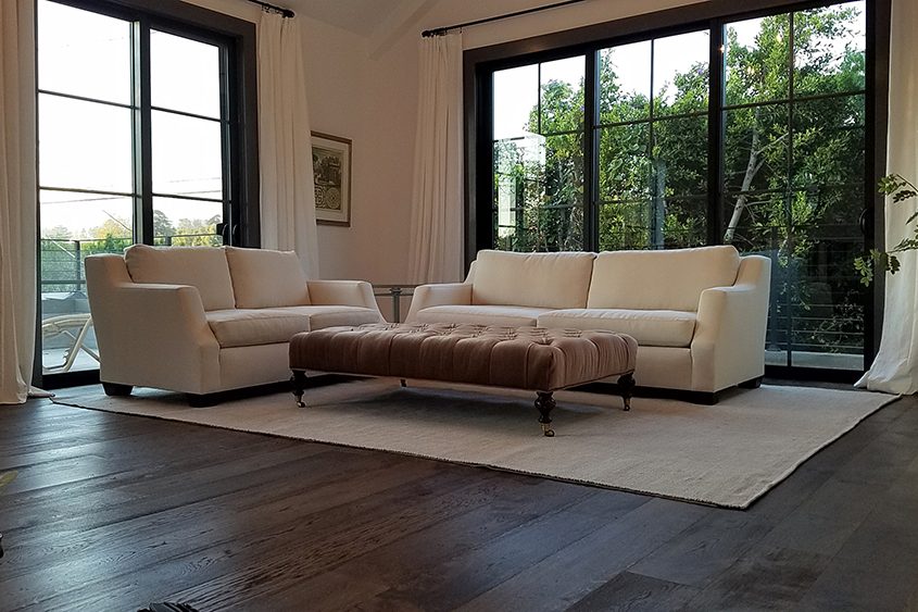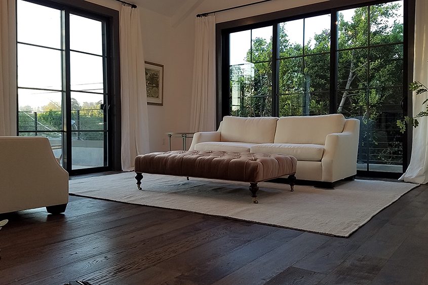 Before we moved our furniture out, we measured to make sure we got the right size rug. When you do this, try to include all the large furniture pieces on the rug but leave about 18″ of bare floor exposed all around.