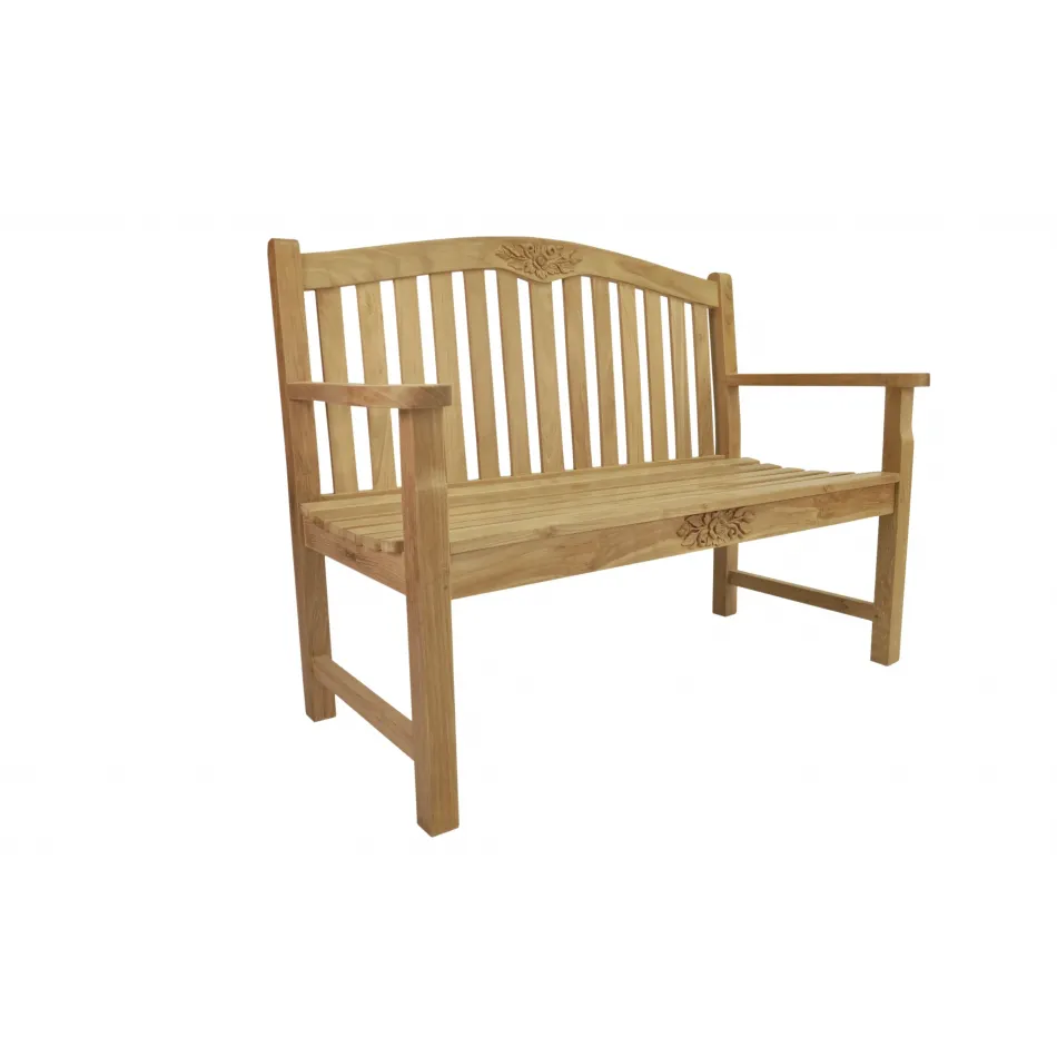 The Rose 50” Round Bench is a one of a kind teak outdoor bench perfect for the yard or patio. Its rose floral motifs are handcrafted by our professional craftsmen who uniquely know the art and beauty of hand carved wood. This simple traditional styled bench will never go out of style, but seamlessly blends with any décor or setting. We have made subtle but careful design changes to ensure excellent back and seating support. Add Sunbrella All-Weather Cushions for added seating comfort, a water repellent material that prevents mildew, mold, and discoloration. Constructed from Premium Teak wood without finish in its natural form and color, it is the perfect material for weathering the outdoors through rain, hail, or shine.