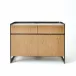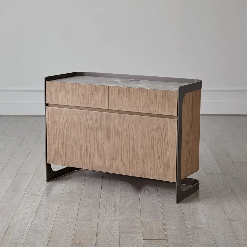 The Element File Cabinet is constructed of American Oak veneer with a warm Aspen grey finish and a grey Spanish marble top surface. The cabinet features two storage drawers and one drawer that holds letter and legal file folders on a suspension rail. Includes soft-close drawers and a cable management port.