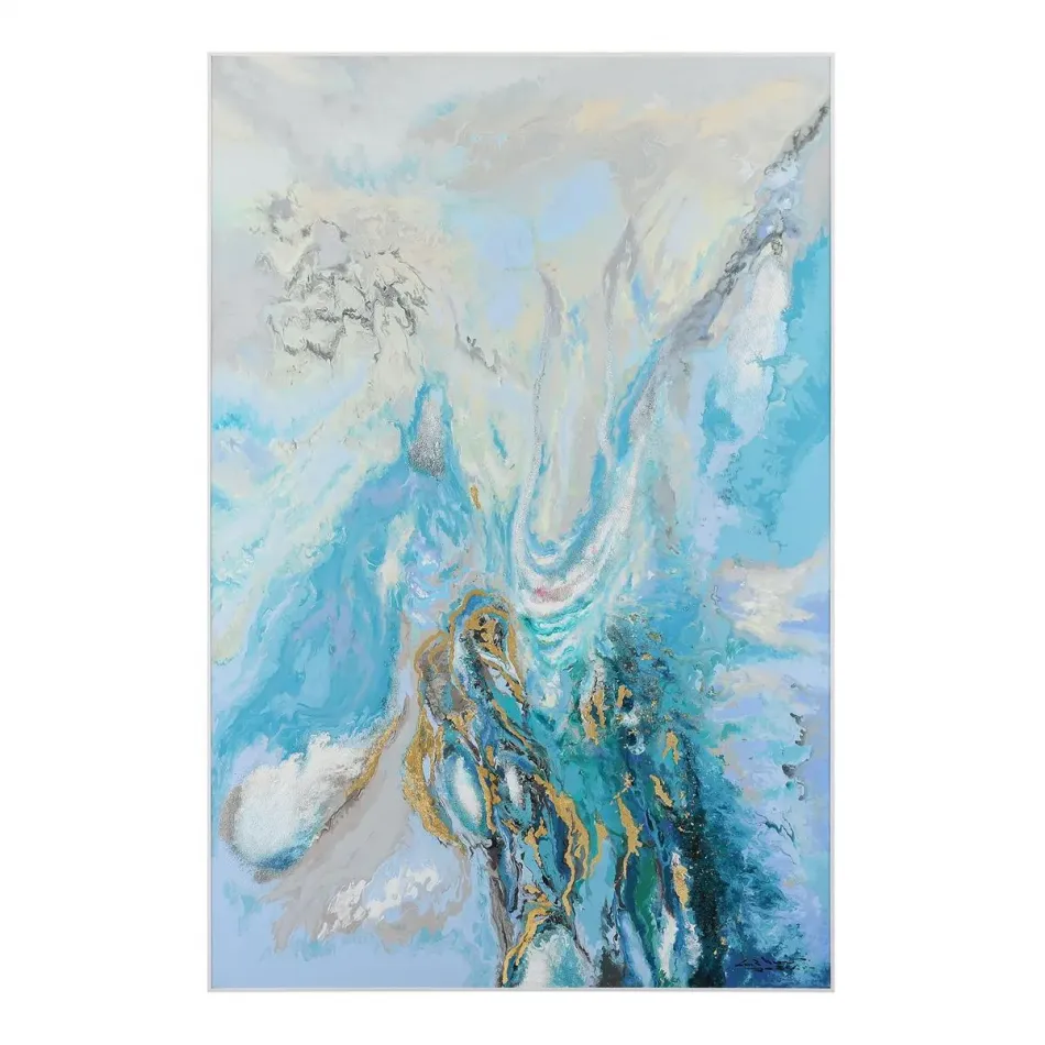Boundless Horizons is a magnificent oil painting on canvas that elevates an interior space through mesmerizing patterns and a rich sense of motion. Delicate shades of blue and green augmented with traces of gold leaf blend with pristine whites and misty grays to create a spiraling cloudscape. Textural beads have been applied to the surface, contributing additional dimension to complete the look. The piece is held within a white aluminum gallery frame.