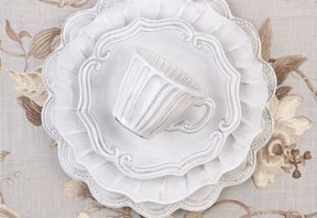We love Incanto White dinnerware from Vietri. It’s glamorous enough for a Kardashian family dinner. But it’s also right at home at…well, home. Incanto makes a lovely display on the shelves in the background of this episode of Semi-Homemade Cooking with Sandra Lee.